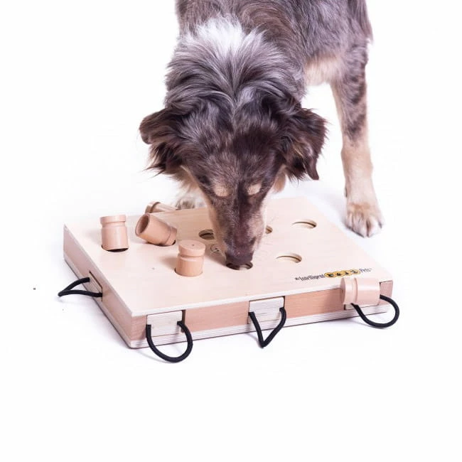 Schritt 3: Verwende am Anfang das Spiel ohne die Spielsteine. Erst wenn dein Hund die Aufgaben ohne Schwierigkeiten löst, erschwere den Schwierigkeitsgrad durch die Zugabe der Spielsteine auf der Oberfläche. Dadurch wird dein Hund immer wieder aufs Neue gefordert.