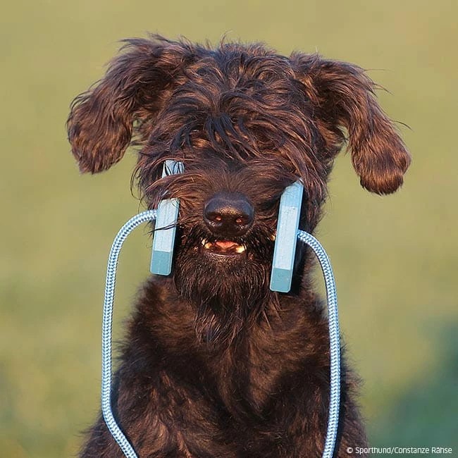 Die wasserbeständig verleimten Multiplex-Seitenteile sind besonders robust, bruchfest und witterungsbeständig. Die durch den Steg führende Kordel (PPM-Seil) bietet dem Hundeführer die Möglichkeit, Zug auf das Apportel zu geben, ohne dieses zu berühren. Damit wird das feste und ruhige Halten kontrolliert, während die Hilfe nach und nach abgebaut wird.