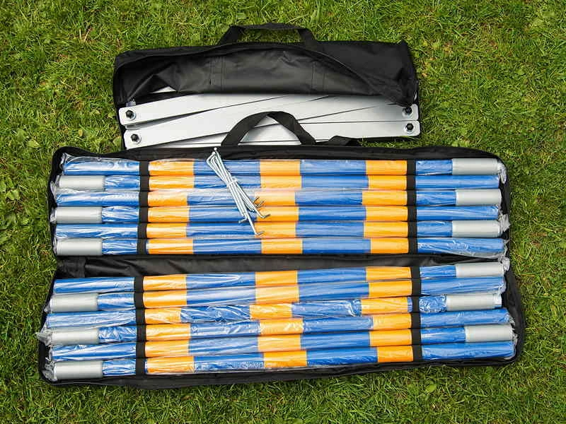 In zwei praktischen Tragetaschen liefern wir die stabile Metallbasis und 12 einschraubbare Slalomstangen. Die Basis ist so ausgelegt, dass der Slalom ganz normal und FCI-Konform gerade aufgestellt werden kann. Dank der “Gelenke” lässt sich aber auch eine Gasse bilden. Das ist für den Aufbau des Slaloms für den Hund eine tolle Hilfe. Nach Benutzung können die Stangen einfach abgeschraubt und die Metallbasis wieder zusammengeschoben werden. So passt der Slalom problemlos in den Kofferraum.