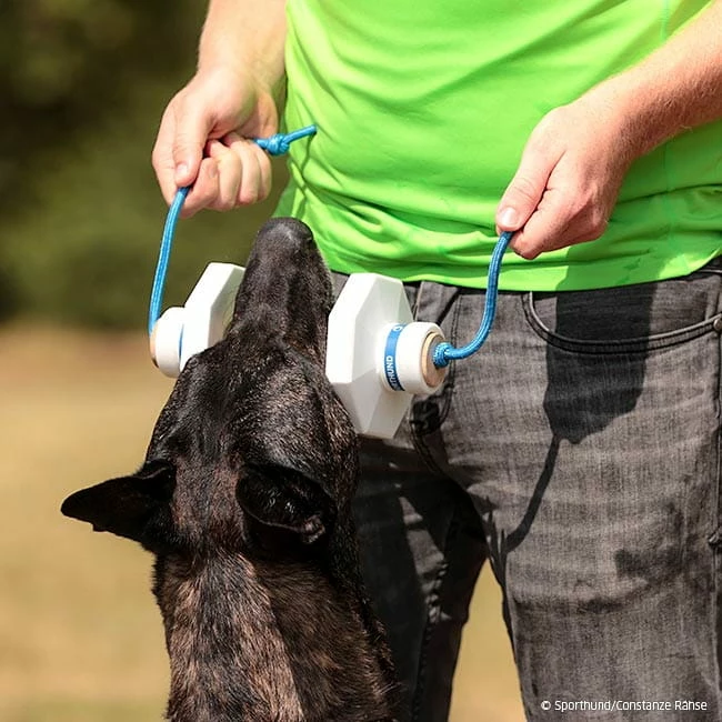 Die durchgängige Kordel gibt dem Hundeführer die Möglichkeit, durch leichten Zug Belastung auf das Holz zu geben und so einen noch sichereren Griff zu fördern.