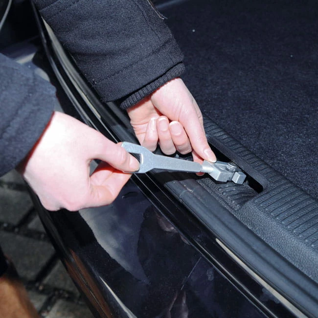 Er wird in den Haltebügel des Kofferraumdeckels eingeschraubt und oben kann dann die Falle einrasten. Es entsteht ein Schlitz, der – natürlich nur bei einem parkenden Fahrzeug – für eine Belüftung an heißen Tagen sorgt.