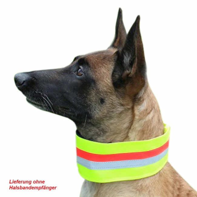 Leuchtgelbes Hundeband aus PVC mit eingearbeitetem Tunnel aus flexiblem Material zum Einziehen von technischen Hundehalsbändern wie z.B. Ortungsgeräten.
