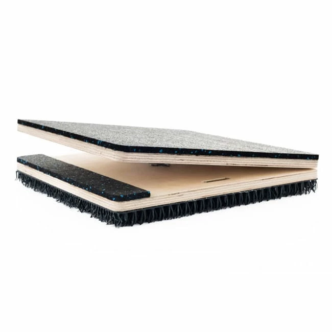Es besteht aus wasserabweisendem Sperrholz mit einer abriebfesten Gummiauflage auf der Oberseite. Die Unterseite ist mit einer Art “Kunstrasen” belegt um ein Verrutschen zu vermeiden.